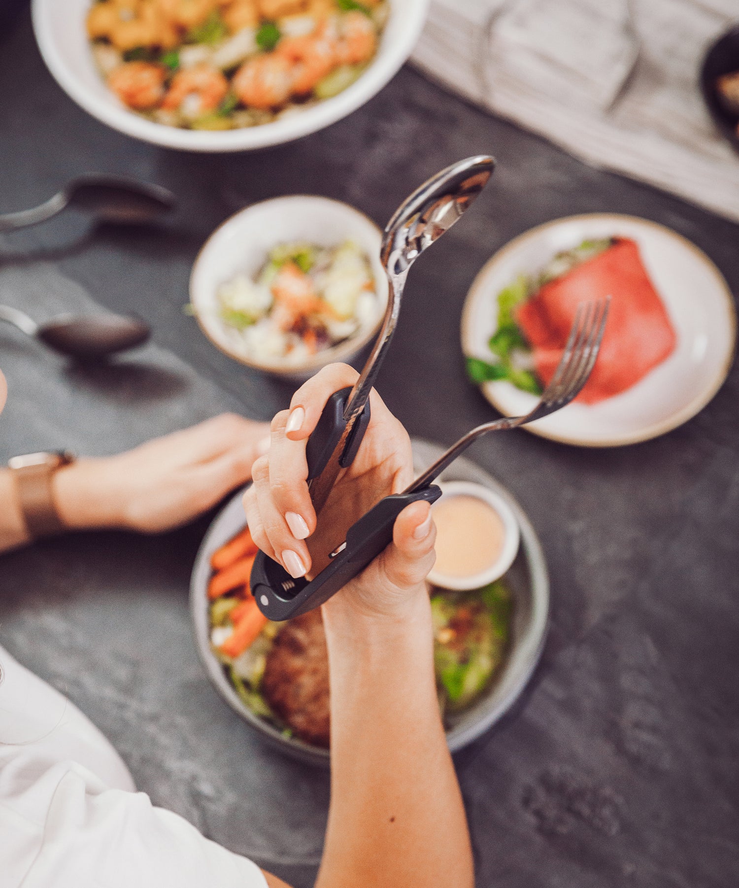 They're easy to control. And surprisingly versatile. You can turn a spoon and a fork into salad servers. Or two spoons into tongs for getting bagels out of the toaster. Or two forks into a pair of grill tongs. Any tongs, any time.